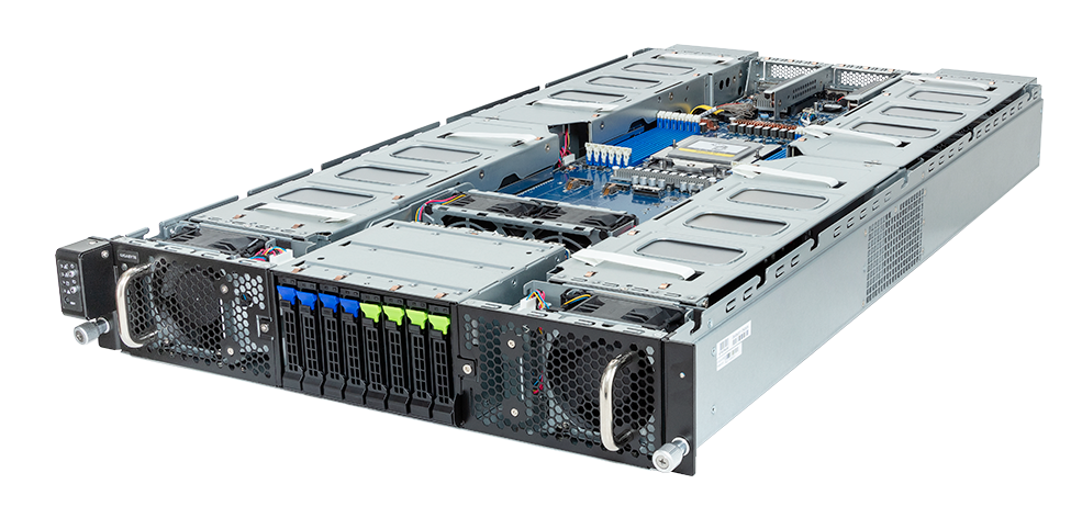 HPC/AI Server - AMD EPYC™ 9005/9004 - 2U UP 8 x PCIe Gen4 GPUs (with PCIe switches). Supports up to 8 x Dual slot Gen4 GPUs; Single AMD EPYC™ 9005/9004 Series Processors; 12-Channel DDR5 RDIMM, 12 x DIMMs; Dual ROM Architecture; 2 x 10Gb/s LAN ports via Broadcom® BCM57416; 4 x 2.5" Gen5 NVMe/SATA/SAS hot-swap bays; 4 x 2.5" SATA/SAS hot-swap bays; 2 x M.2 slots with PCIe Gen5 x4 interface; 8 x FHFL PCIe Gen4 x16 slots for GPUs; 2 x LP PCIe Gen5 x16 slots for add-in cards; Dual 3000W 80 PLUS Titanium redundant power supply