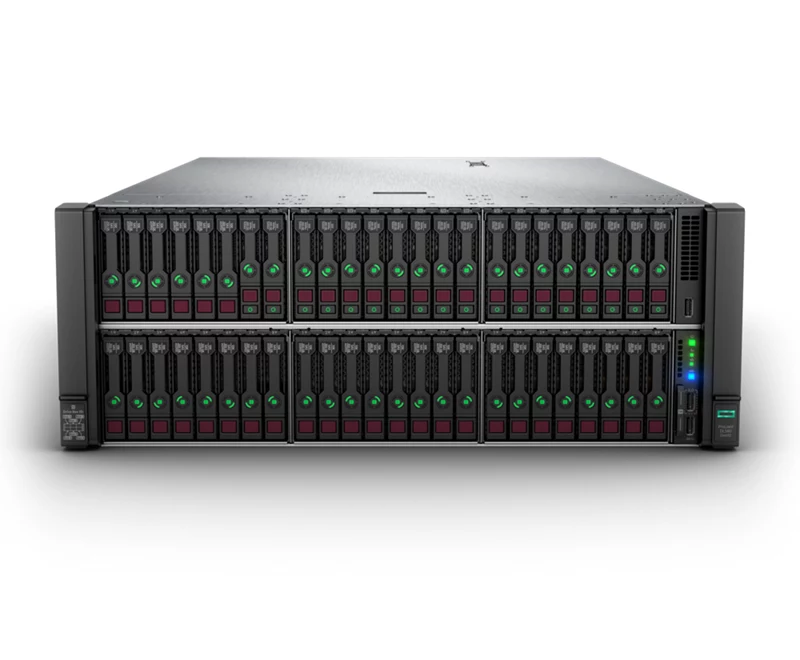 Сервер HPE ProLiant DL580 Gen10 с четырьмя процессорами Intel® Xeon® 8260, 512 ГБ оперативной памяти, восемью отсеками для накопителей малого форм-фактора и четырьмя блоками питания мощностью 1600 Вт.