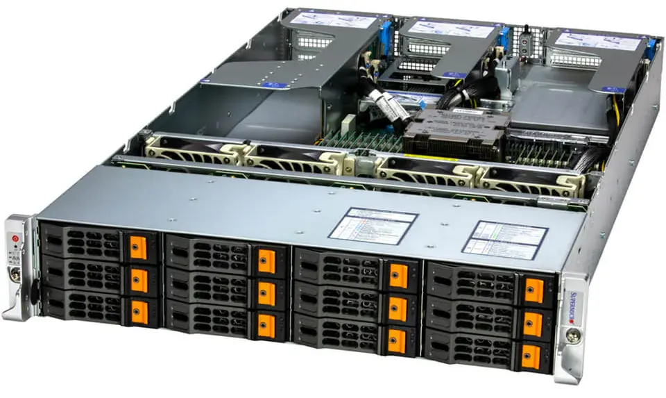 Стоечный сервер Supermicro AS-2015HS-TNR. Оптимизирован для виртуализации, искусственного интеллекта, машинного обучения, облачных компьютеров и корпоративных серверов. Процессор AMD EPYC серии 9004. Двойной резервный источник питания. 12 отсеков для дисков NVMe/SATA/SAS с возможностью горячей замены 3,5/2,5 дюйма